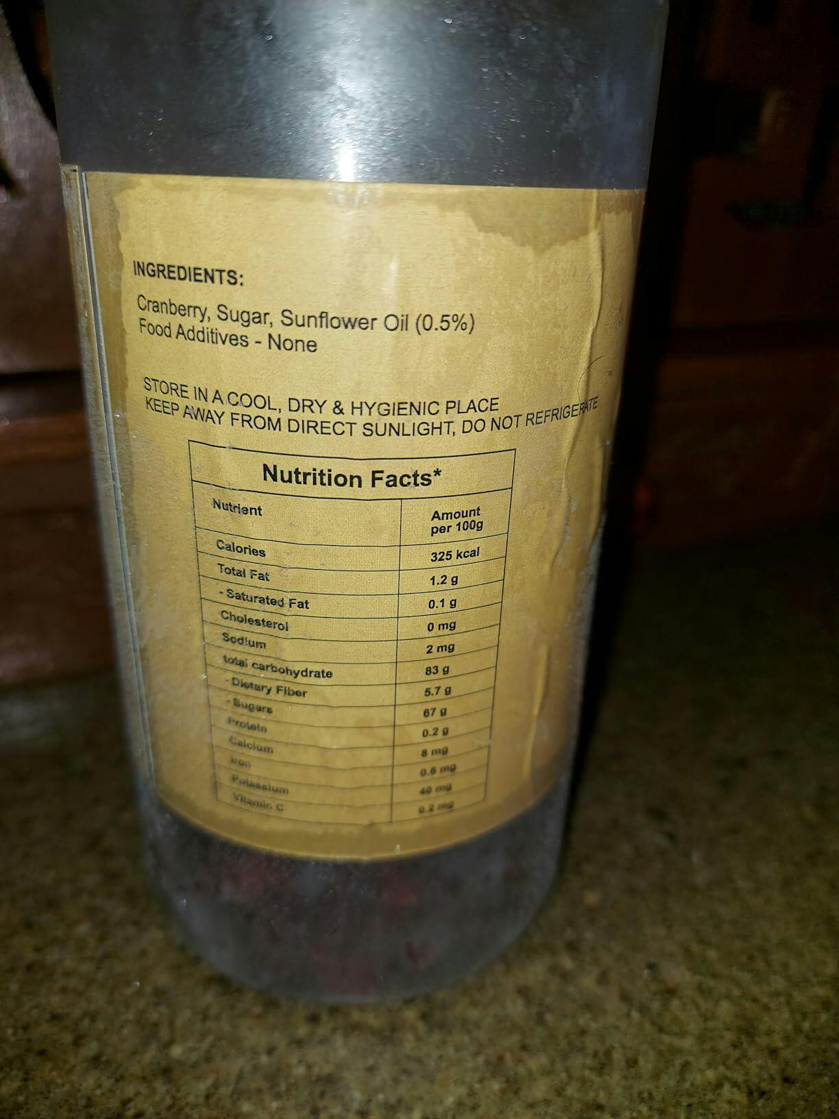 It is not 100 percent cranberry....it has sugar and sunflower oil....cranberry is not whole...they are split in pieces. Taste is good. Disappointed to see sugar in the ingredients list.