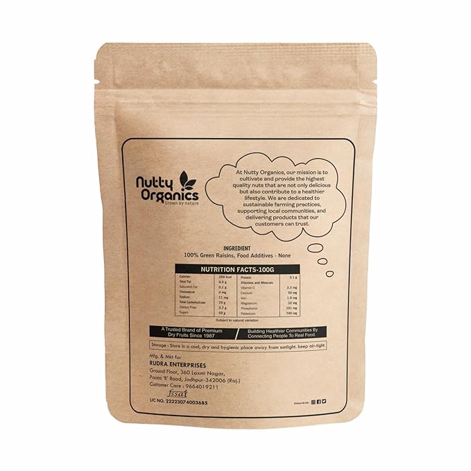 - Free from preservatives and artificial additives, NUTTY ORGANICS Green Raisins offer a pure and natural treat that supports your overall well-being and enhances your healthy lifestyle.