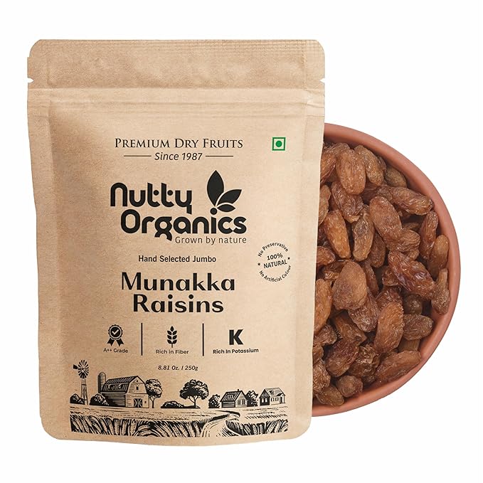 Nutty Organics Munaka Raisins (1000g) are a delicious and nutritious snack that offer a perfect blend of taste and health benefits. Sourced from high-quality organic farms, these raisins are naturally rich in iron, which supports healthy blood circulation and helps prevent iron deficiency. They are also packed with protein, making them an excellent choice for those looking to incorporate more plant-based protein into their diet. In addition to being a great source of essential nutrients like fiber and antioxidants, Munaka raisins are known for their sweet, natural flavor, making them a tasty addition to cereals, smoothies, or even as a stand-alone snack. Whether you're looking to improve your overall health or simply enjoy a wholesome treat, Nutty Organics Munaka Raisins offer a nutrient-dense option that satisfies both your taste buds and your dietary needs.