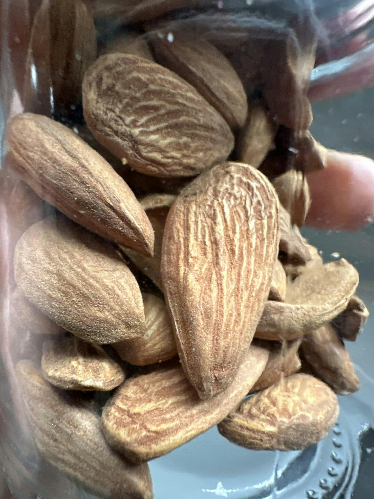 You can tell these are organic and high-quality. The smell when you open the bag is amazing - just like fresh, rich nuts. They are very sturdy and crunchy, not brittle at all. The moisture content seems perfect; they're not dried out or rubbery. Most are a good size, though you get a few smaller ones. I eat them for the health benefits like protein and magnesium, and they feel much more potent than regular almonds. A bit pricey, but you get what you pay for.