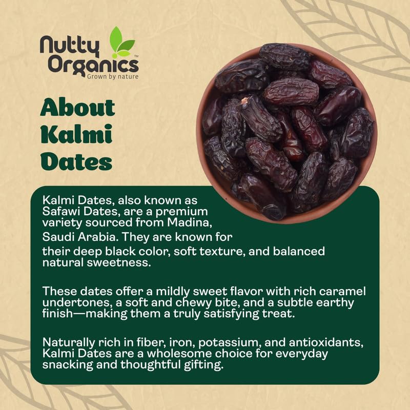 Nutty Organics Premium Kalmi Dates are a perfect blend of natural sweetness, softness, and nutrition. These dates are fresh, moist, and chewy, with no added sugar or preservatives. Rich in dietary fiber and naturally low in fat, they’re great for digestion, energy boosts, or healthy snacking. The Kalmi variety is known for its rich flavor and soft texture, and this pack delivers exactly that. Whether eaten on their own or added to smoothies, desserts, or breakfast bowls, they’re a delicious and guilt-free treat.